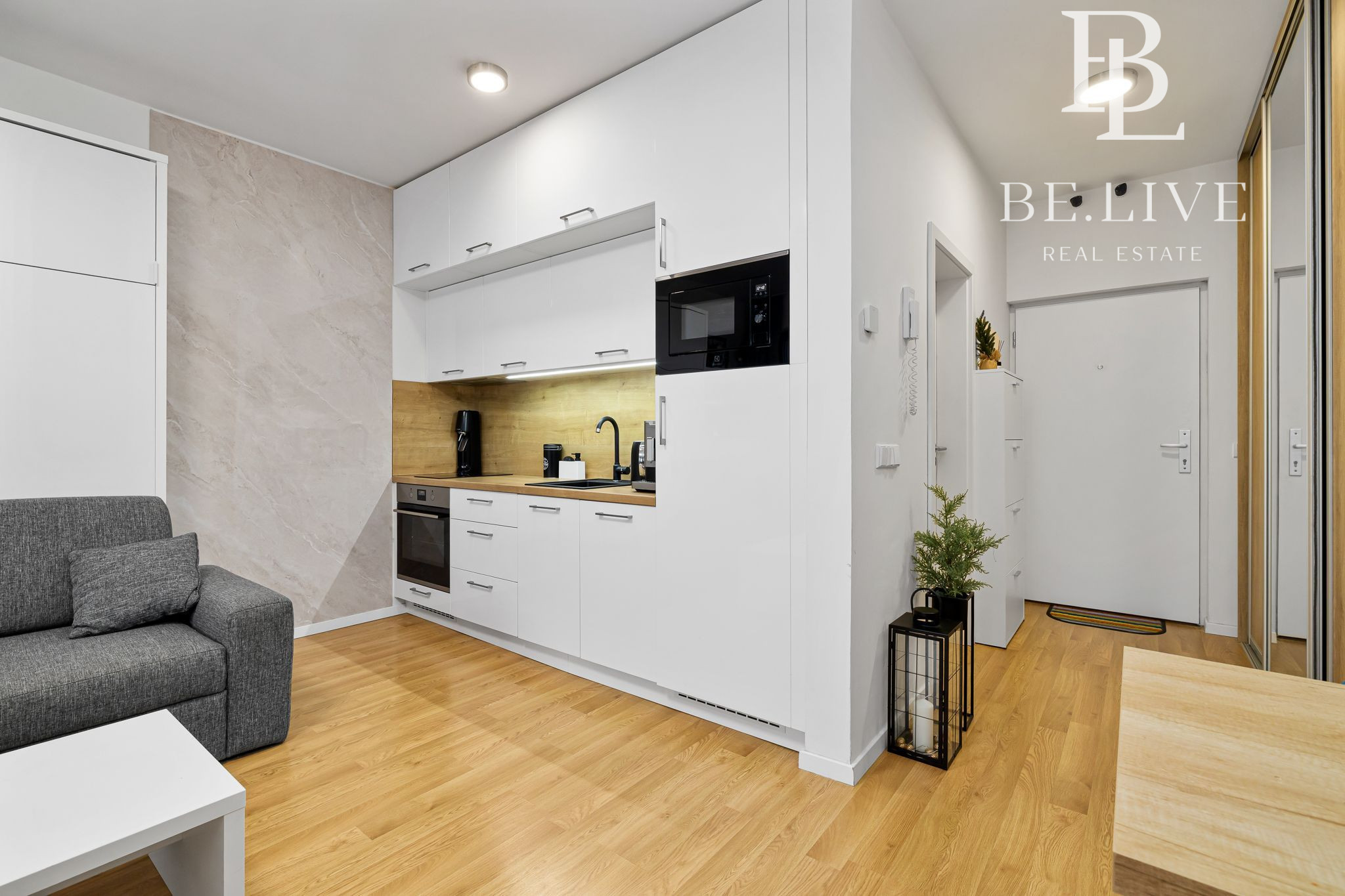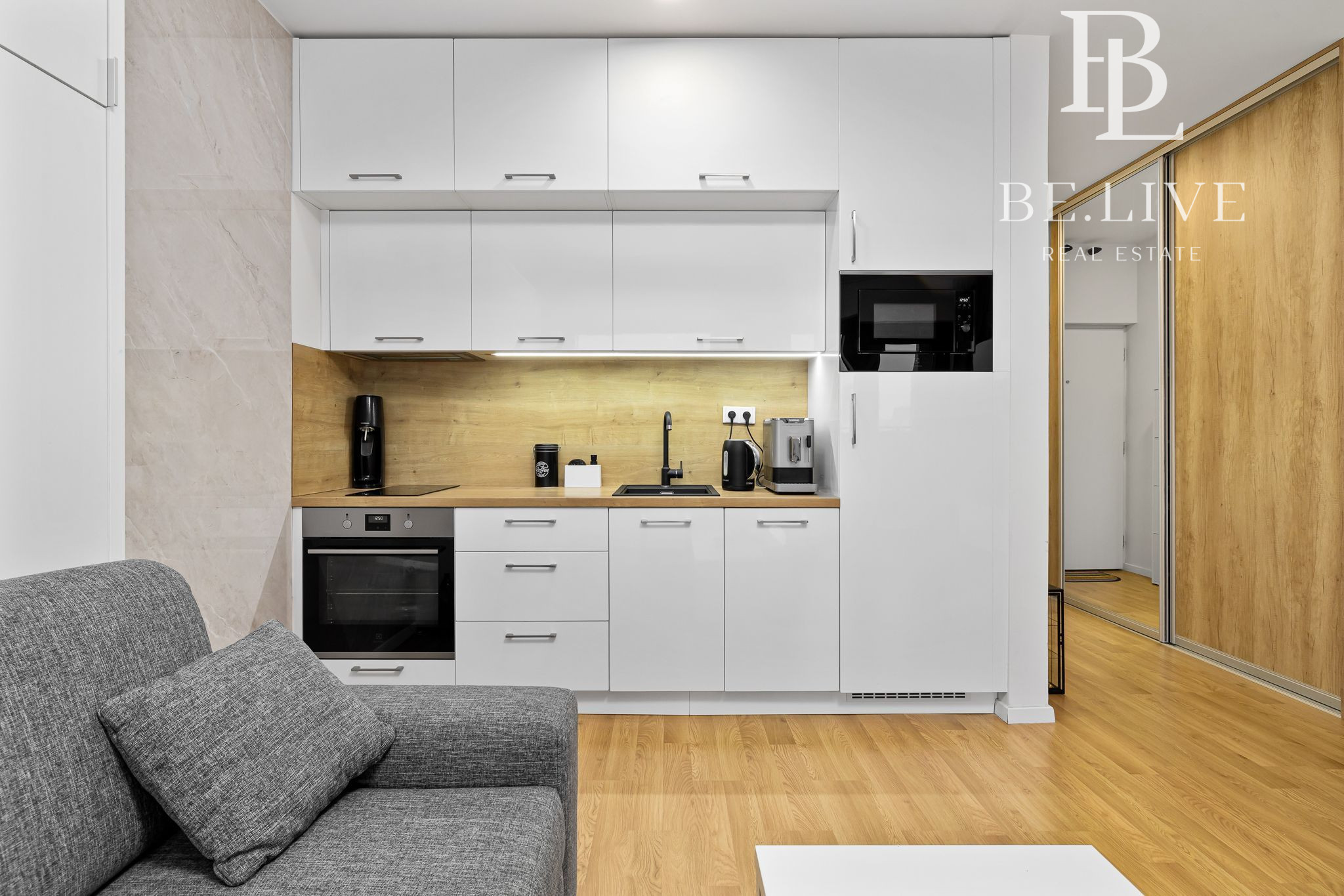 • Moderná kuchynská linka so vstavanými spotrebičmi : umývačka riadu, indukčná varná doska, digestor, vstavaná chladnička s mrazničkou, mikrovlnná rúra