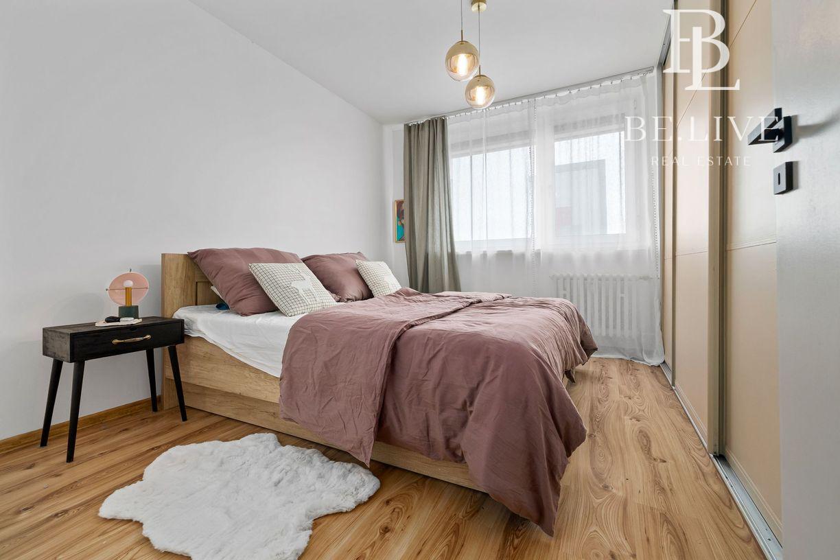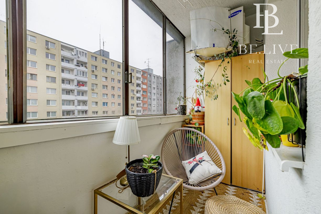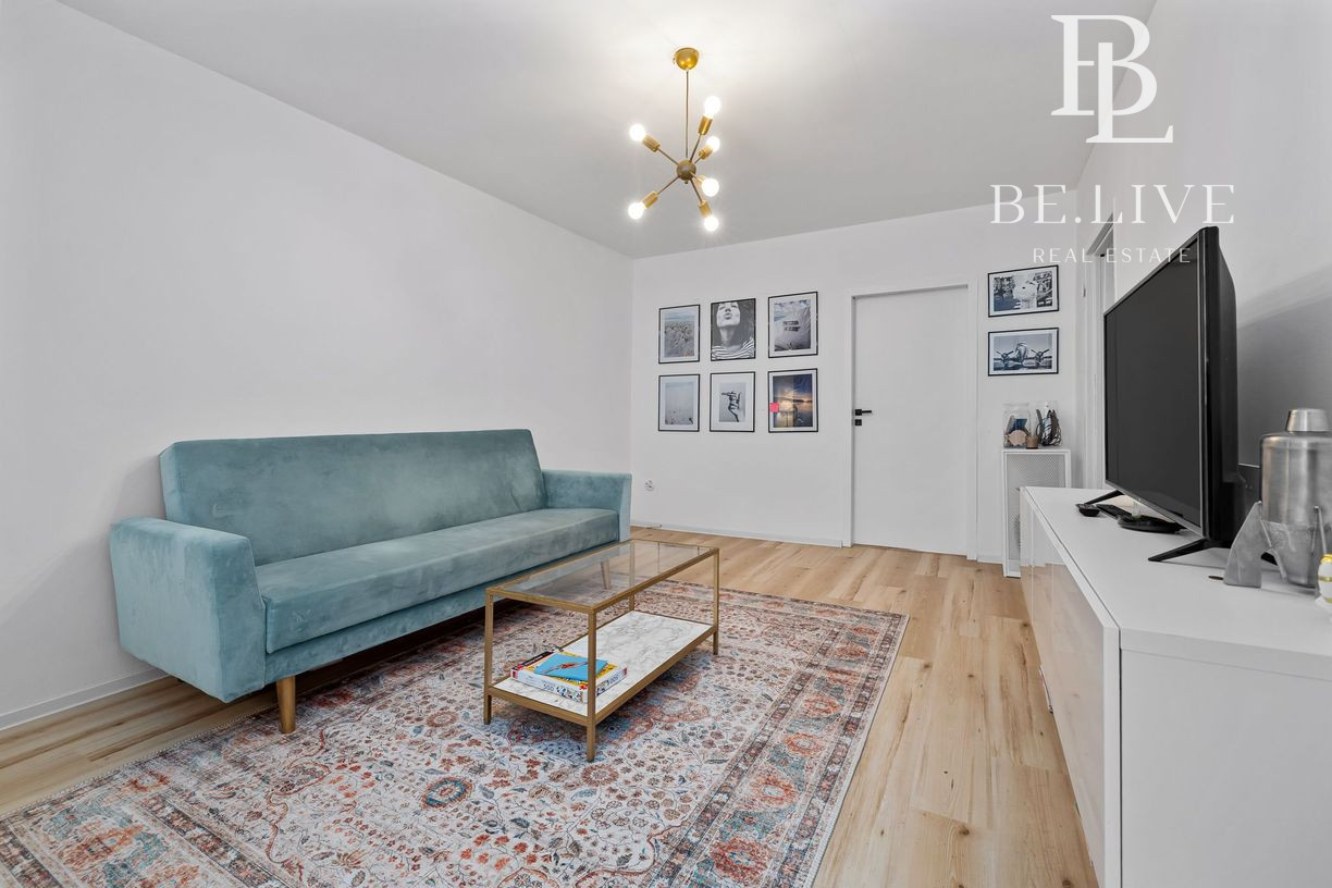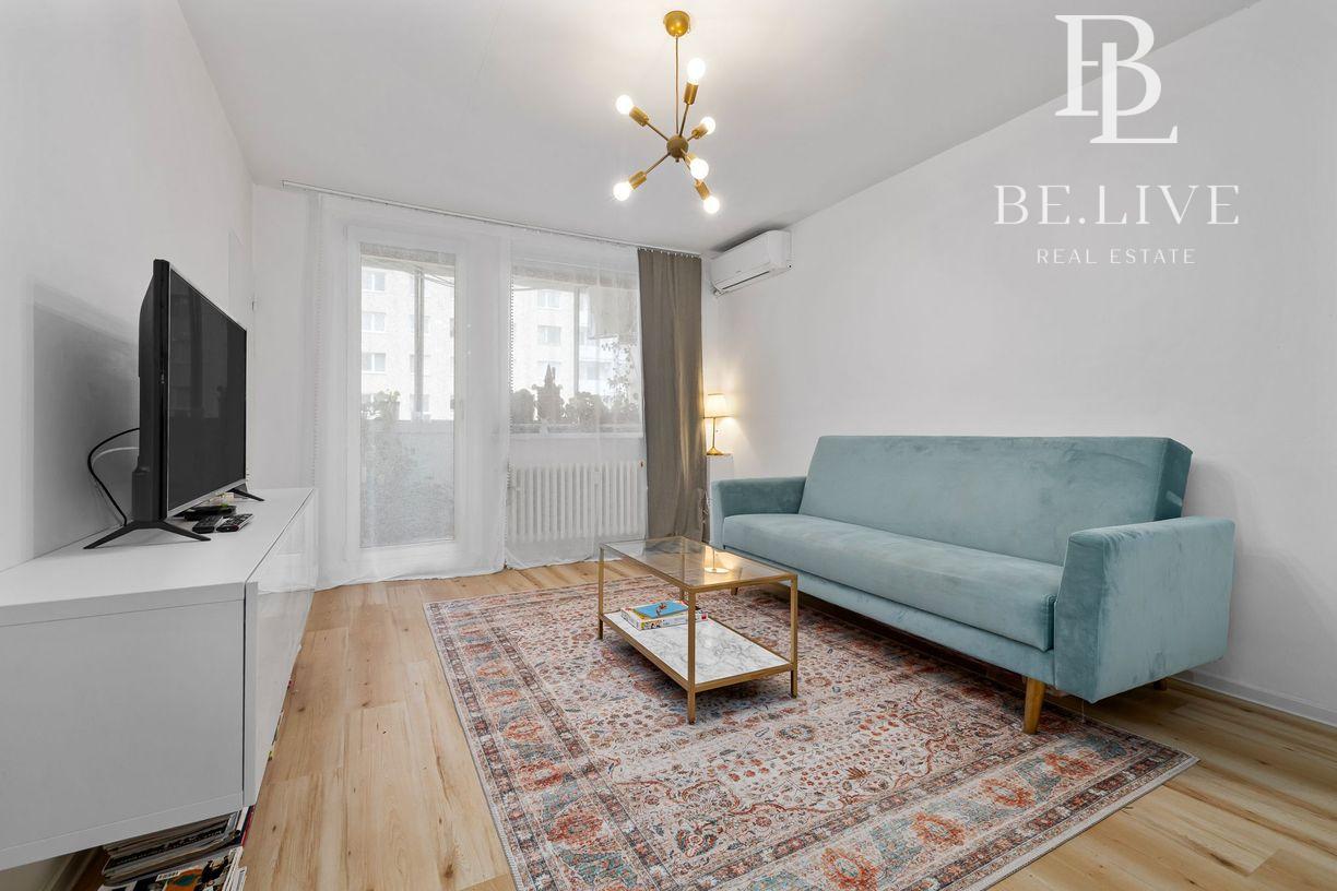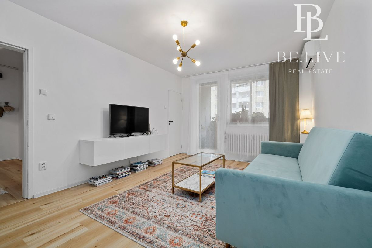 Klimatizácia zabezpečuje komfort počas leta. Orientácia: obývačka sever, spálňa juh.